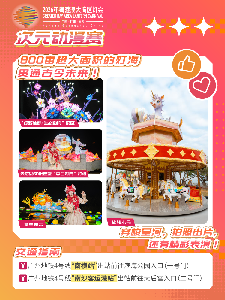 2026年粤港澳大湾区灯会以“湾区同心·华彩千秋”为主题,以“科技赋能文化传承,创新驱动品牌发展”为核心理念,植入更多科技、光影元素,与外部热点IP联动,并联动地方媒体一同打造广东灯会春晚。灯会展期自2月10日至5月10日,长达90天,选址滨海公园、南沙天后宫景区,按“三轴五区”布局,占地800亩,主游线超2.5公里,五大园区各具特色,为游客带来广阔壮丽的观赏空间与充足的赏灯时光。还有《王者荣耀》《熊出没·年年有熊》《剑网3》《喜羊羊与灰太狼》《超级飞侠》《奶龙》《小马菲莉》等超人气动漫电竞IP大型主题花灯组,大湾区灯会展出上百组灯光矩阵!